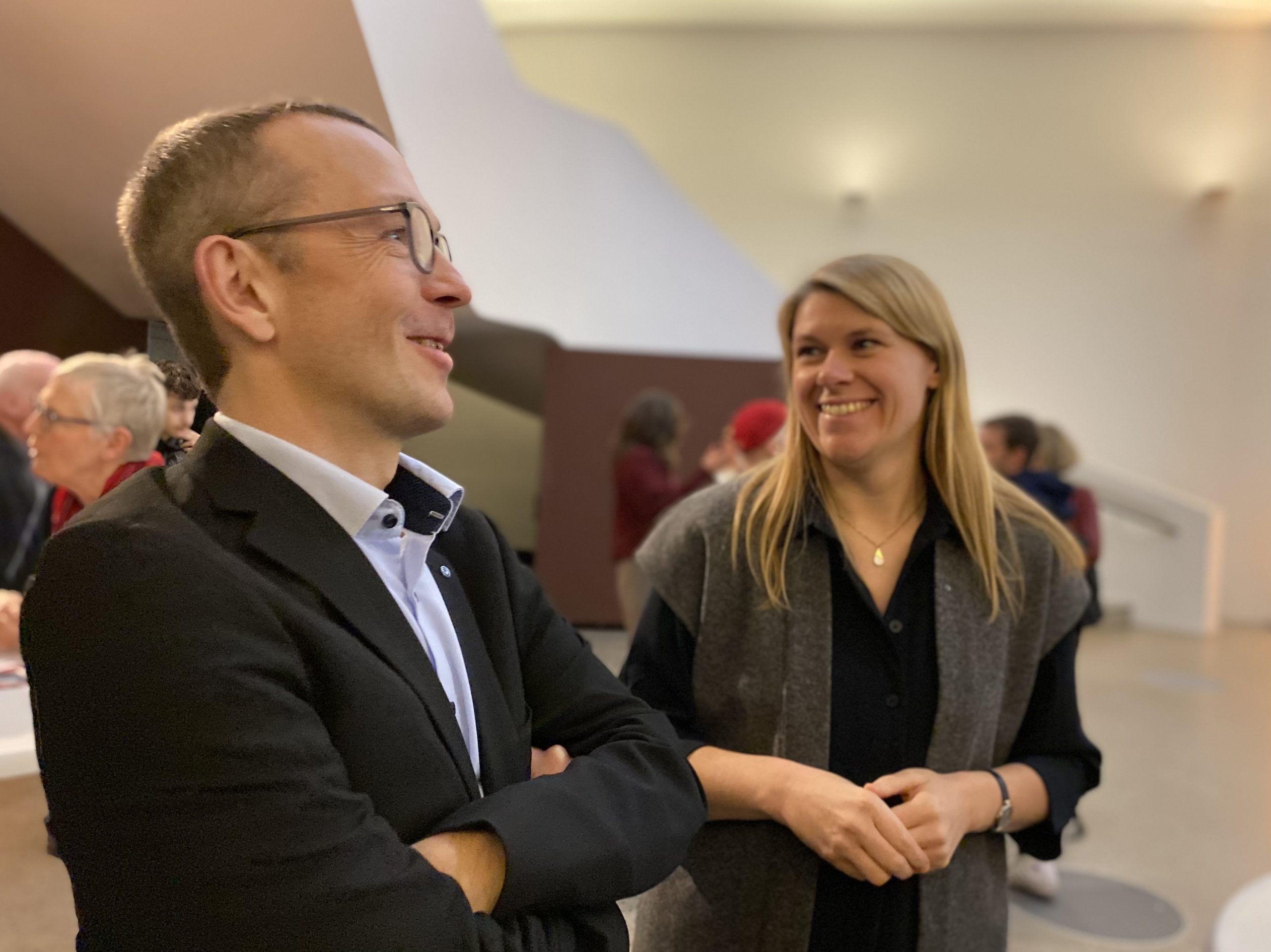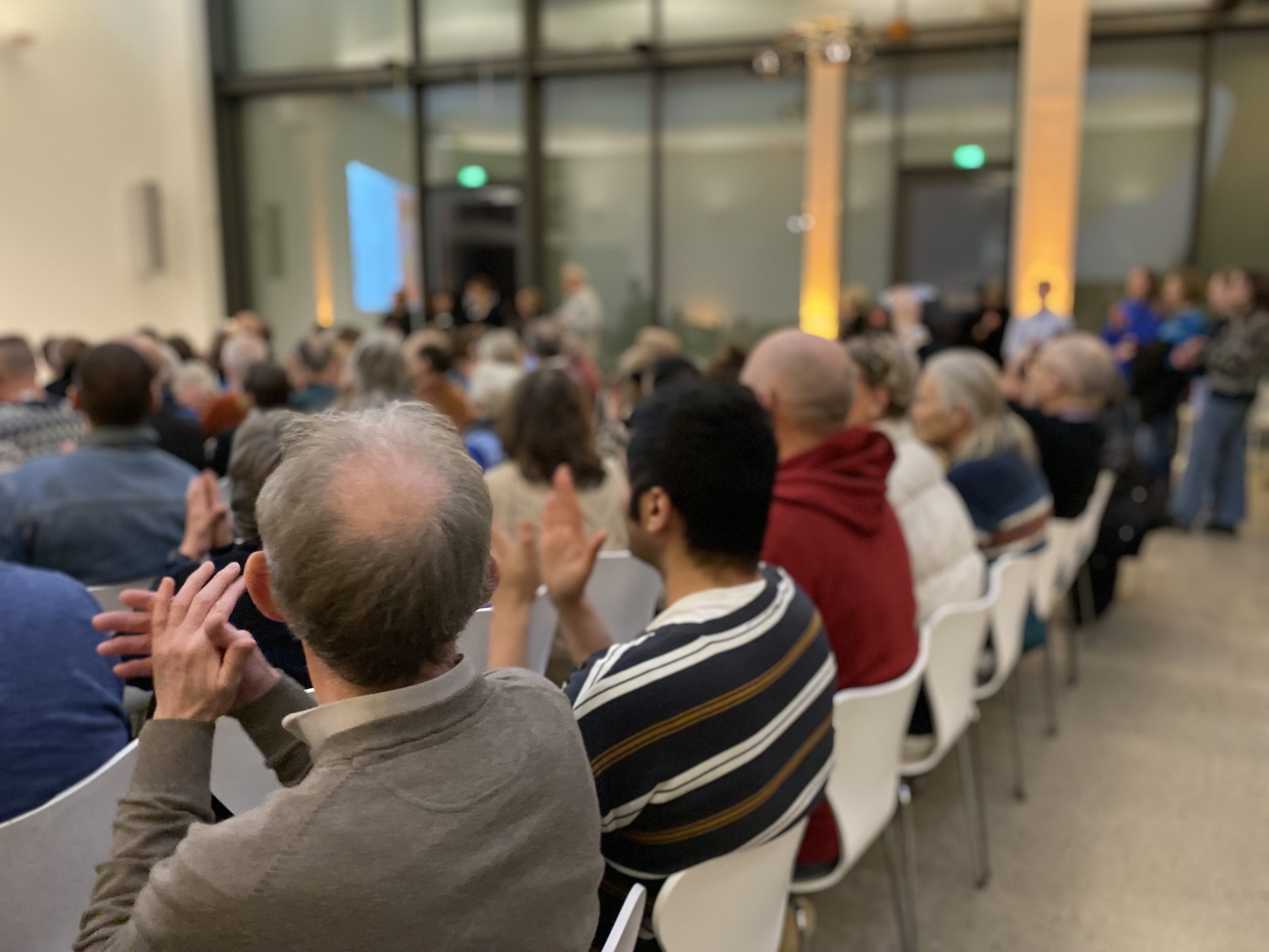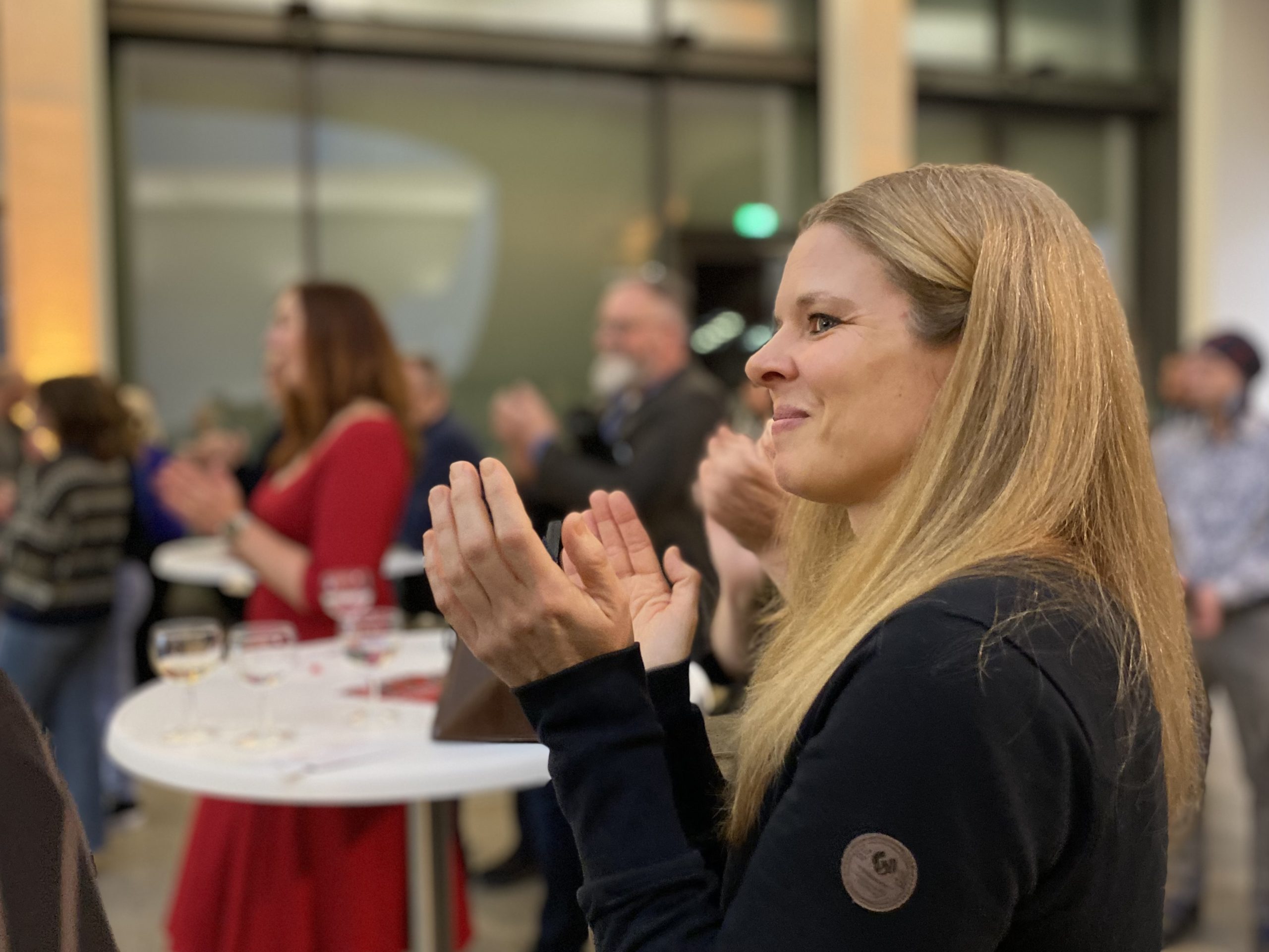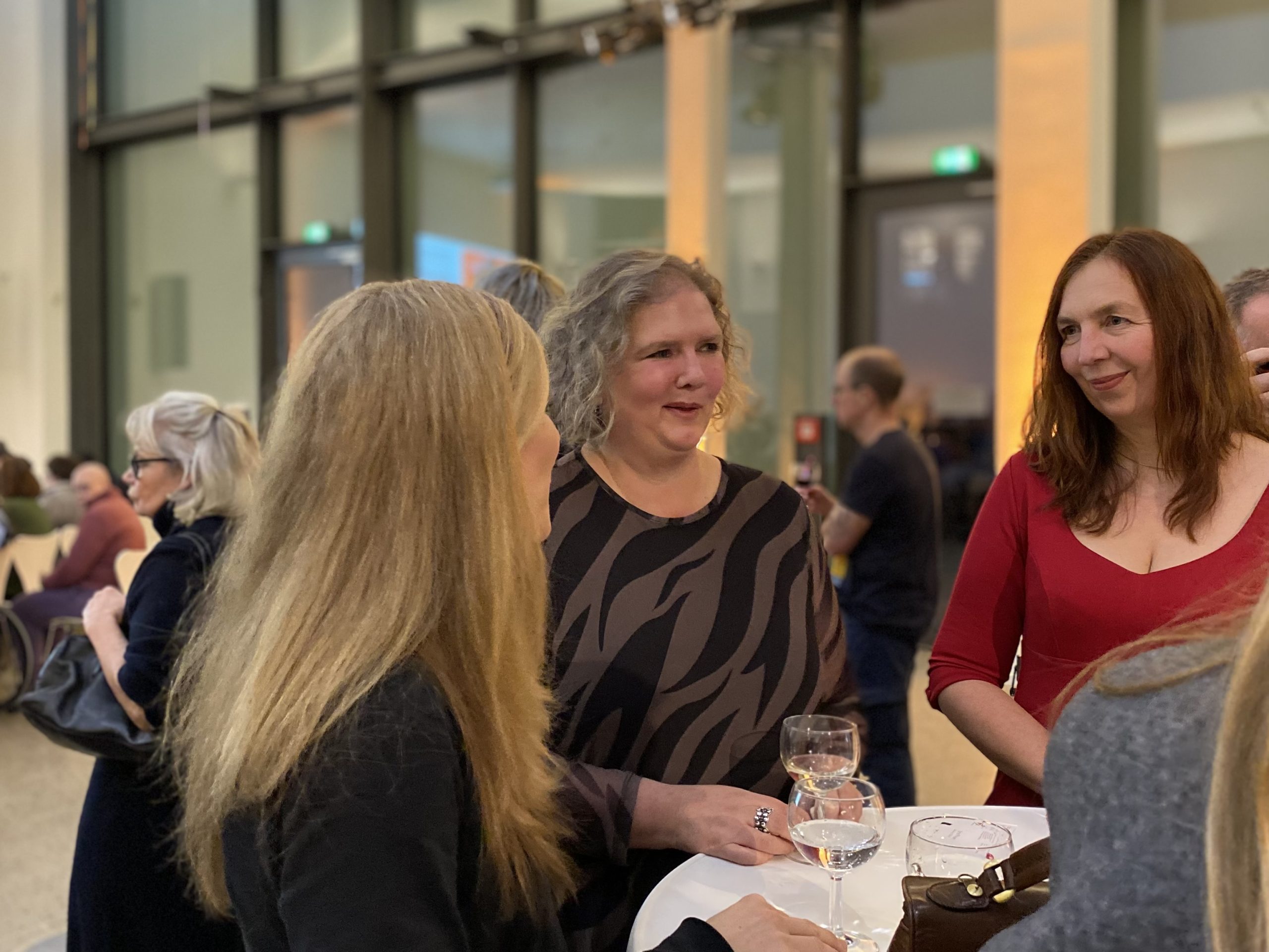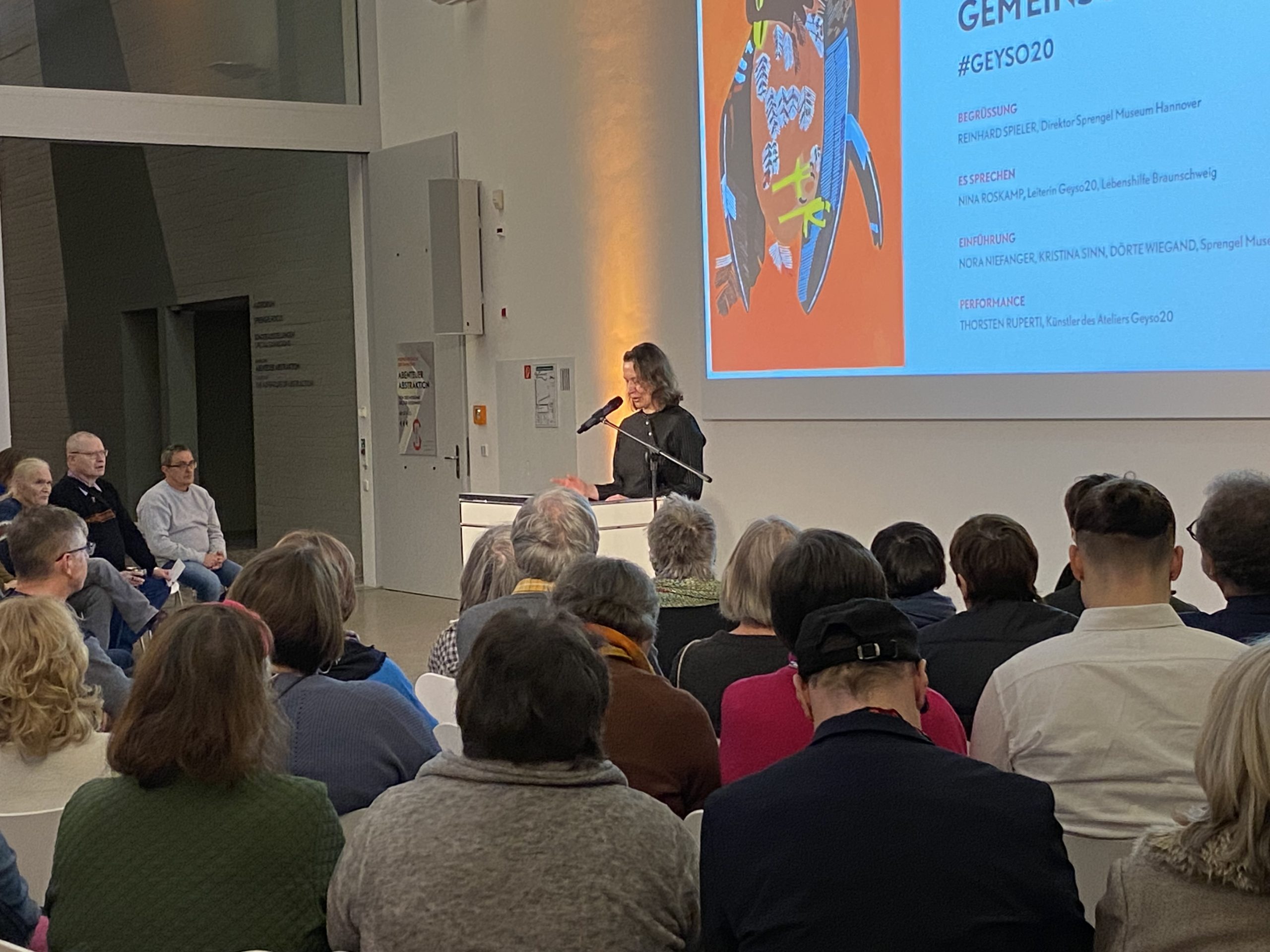 Nach einem ersten Einblick führte der Weg durch die großen, eindrucksvollen Hallen über die gigantische Wendeltreppe des Hauses in den Calder-Saal. Hier warteten bereits Getränke, und die ersten Reden – vom Direktor des Sprengel Museums, Reinhard Spieler, der Leitung von Geyso20, Nina Roskamp, und den drei Kuratorinnen Nora Niefanger, Kristina Sinn und Dörte Wiegand – ließen nicht lange auf sich warten.