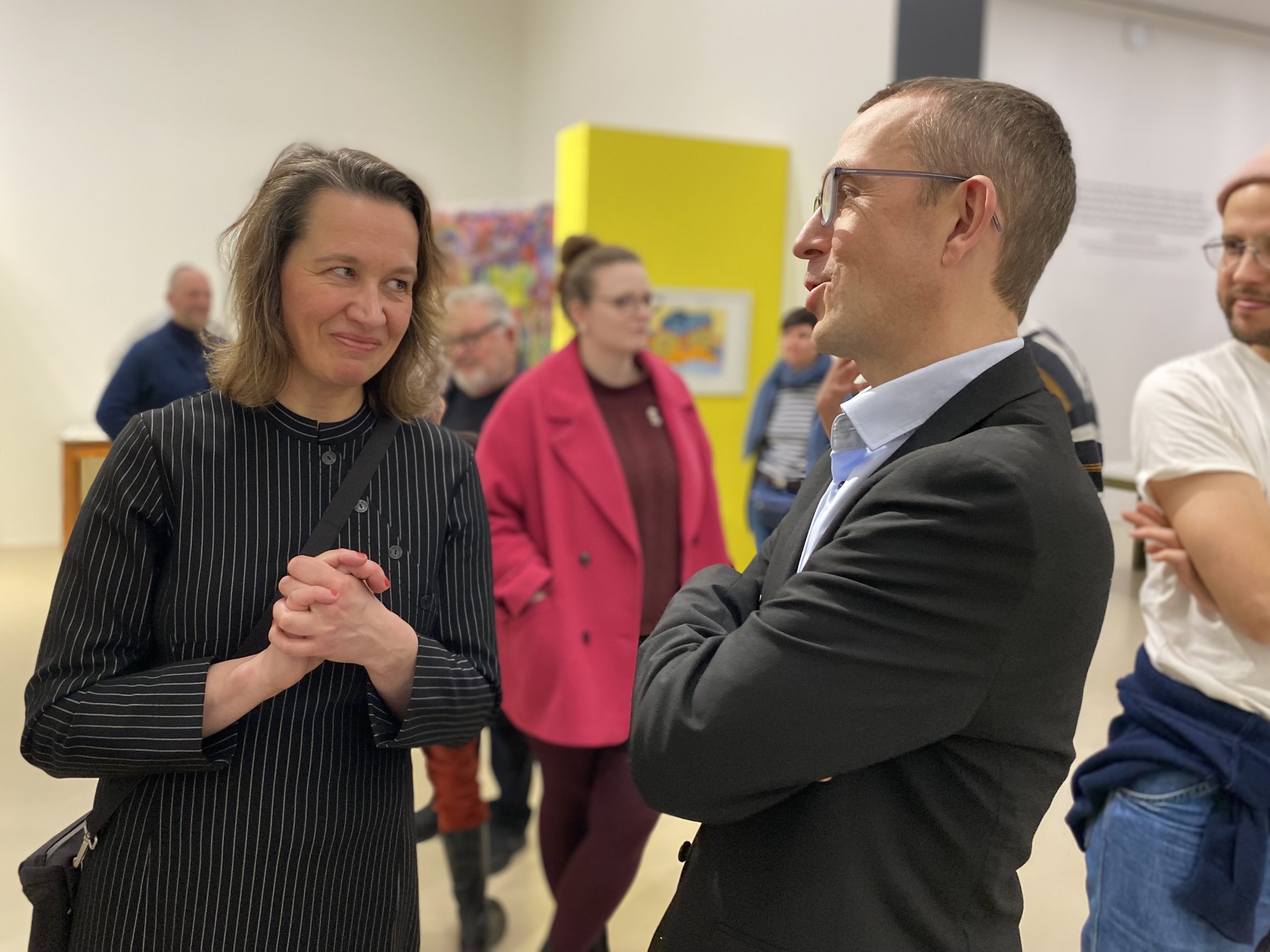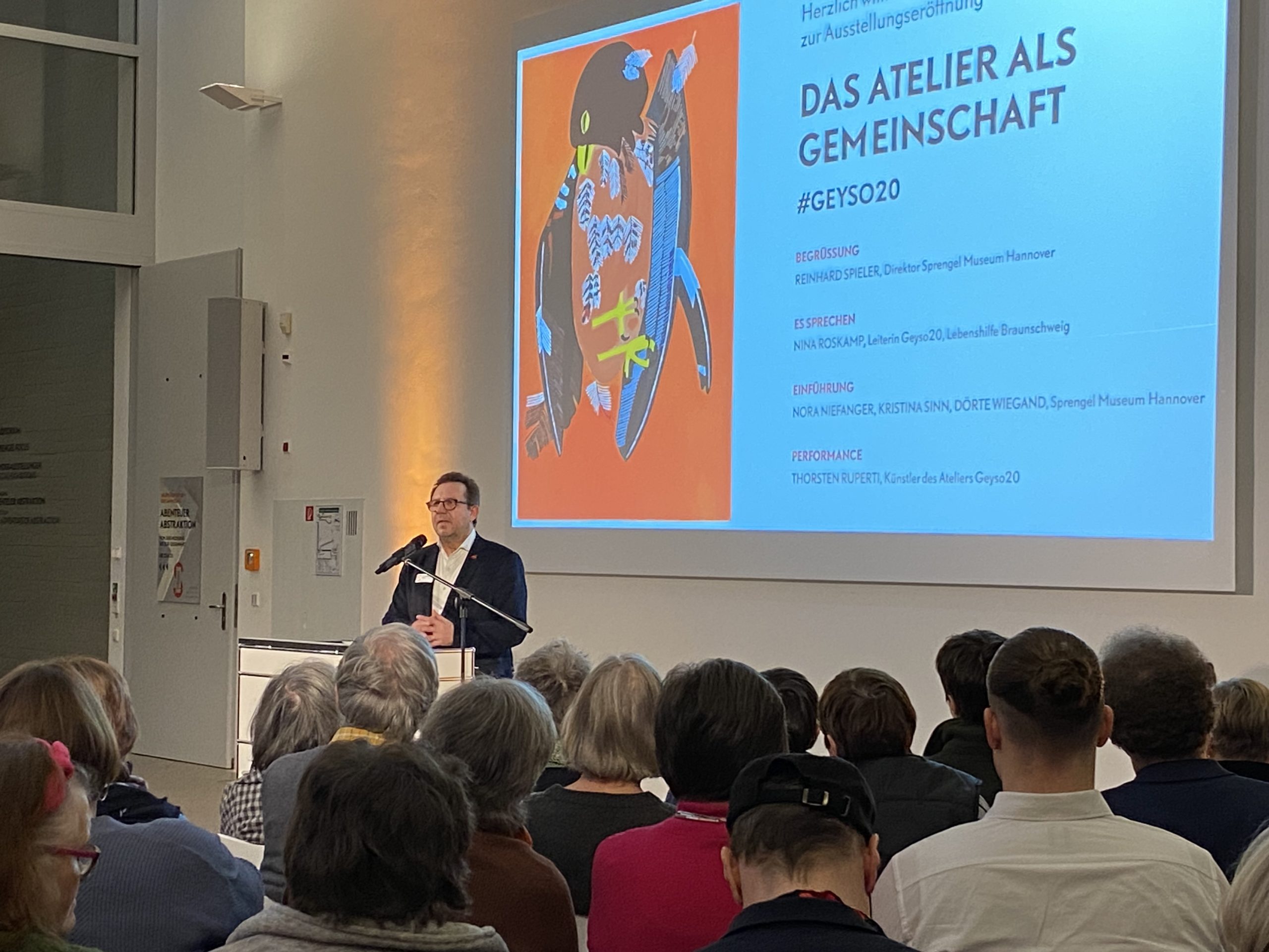 Die Künstler:innen der Ateliergemeinschaft waren voller Freude mittendrin. Auch der Vereinsvorstand und die Geschäftsleitung der Lebenshilfe Braunschweig ließen sich diesen großen Erfolg von Geyso20 nicht entgehen:Geschäftsführer Florian König beglückwünschte Geyso20 zu diesem Erfolg: „Es ist eine Freude zu sehen, dass die gewachsene Institution Geyso20 in einem Haus dieser Strahlkraft präsentiert wird.
