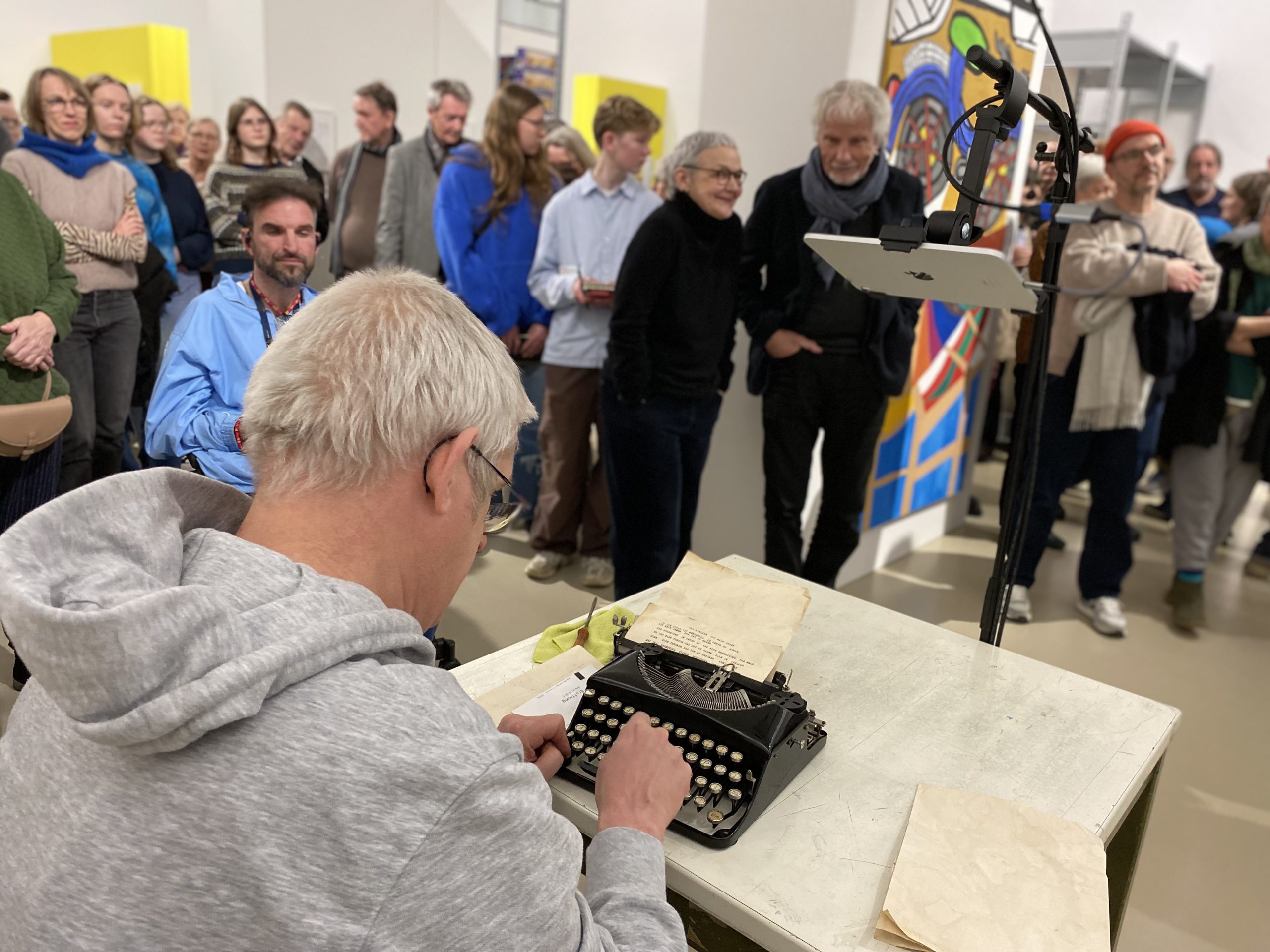 Thorsten Ruperti, seit 1993 Künstler der Ateliergemeinschaft, vertrat seine Kolleg:innen auf der Pressekonferenz und begeisterte das Publikum am Abend mit einer Performance an einer seiner historischen Schreibmaschinen.